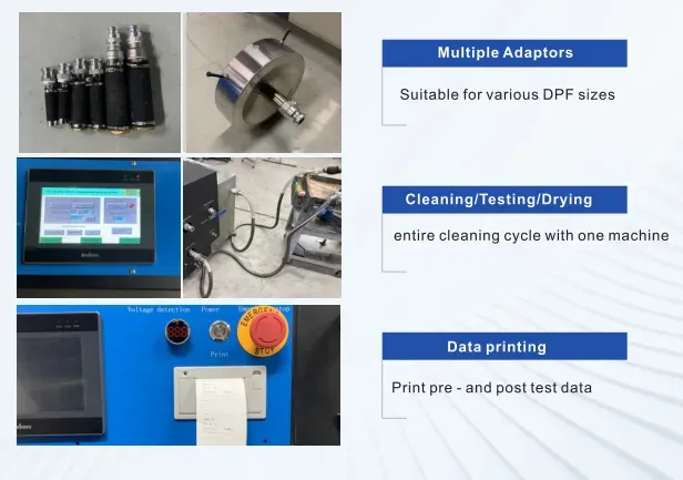 Bukod sa karaniwang pagpapalinis, may dagdag na mga tampok ang makina: mabilis na pagpapatuyo sa mataas na temperatura na 200 degree at pag-print ng datos ng backpressure bago at pagkatapos ng paglilinis